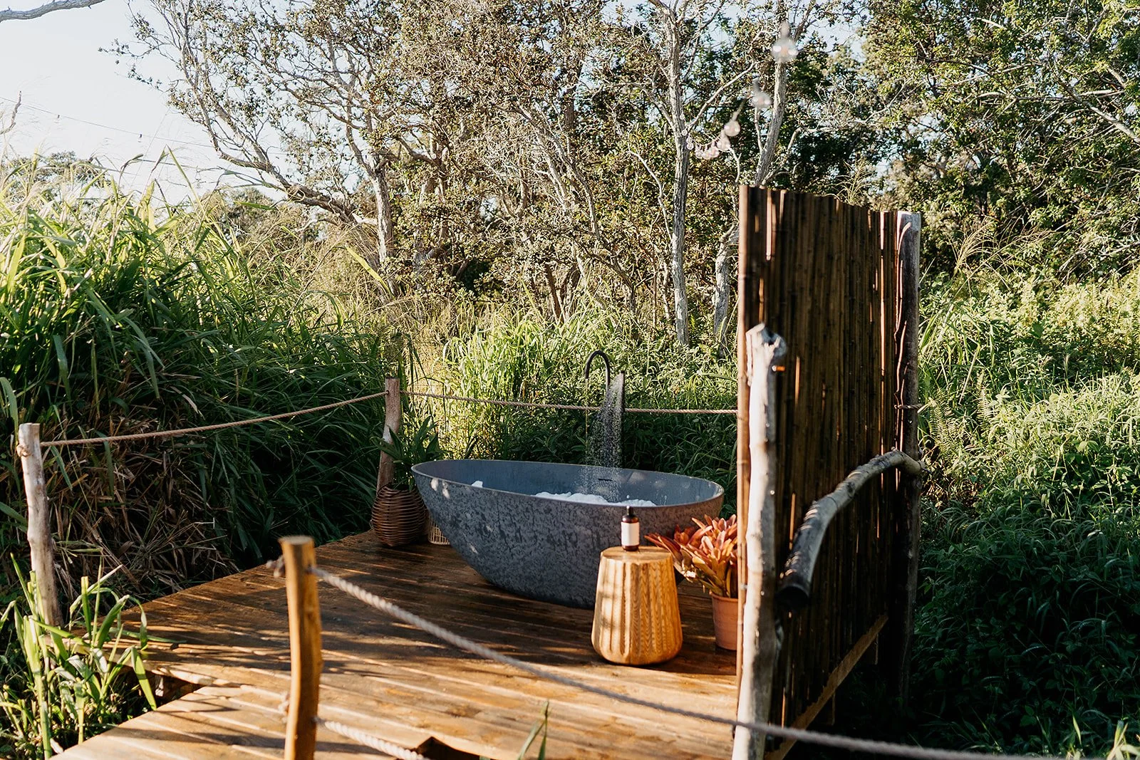 Includes an outdoor concrete tub, propane stove, mini fridge, cookware and dinnerware, Aeropress and kettle, seasonings, games, books, hammock, outdoor lights, and two USB outlets.